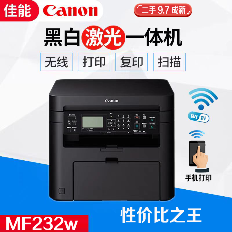 佳能MF232w黑白激光一体机,9.6成新,复印 打印 扫描三合一,带网口,支持无线连接电脑功能,可以无线连接手机,轻松打印手机微信里的内容,硒鼓便宜,可以打印1500张,送货上门,安装到位,保修一年。