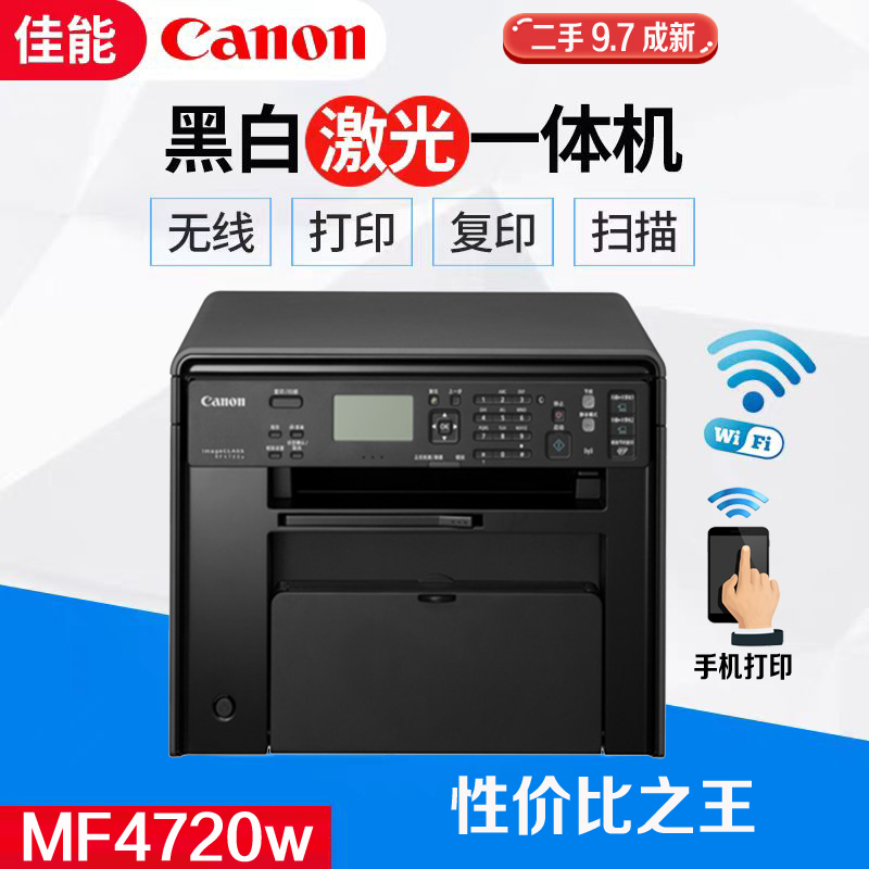 佳能MF4720w黑白激光一体机,9.6成新,复印 打印 扫描三合一,带网口,支持无线连接电脑功能,可以无线连接手机,轻松打印手机微信里的内容,硒鼓便宜,可以打印1500张,送货上门,安装到位,保修一年。