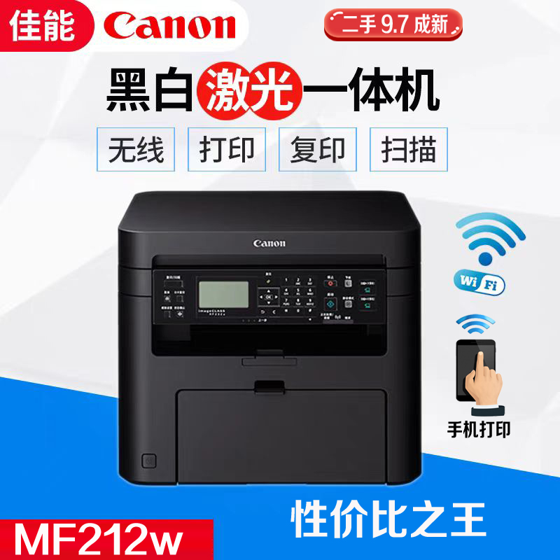 佳能MF212w黑白激光一体机,9.6成新,复印 打印 扫描三合一,带网口,支持无线连接电脑功能,可以无线连接手机,轻松打印手机微信里的内容,硒鼓便宜,可以打印1500张,送货上门,安装到位,保修一年。