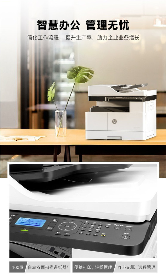 惠普439nda是一款A3黑白激光多功能一体机,集打印、复印、扫描功能于一体,标配自动双面打印和100页自动输稿器,适合商用办公环境。