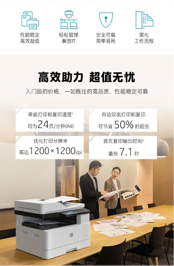 - 高效性能:24页/分钟连续打印不降速,首页输出仅需7.1秒